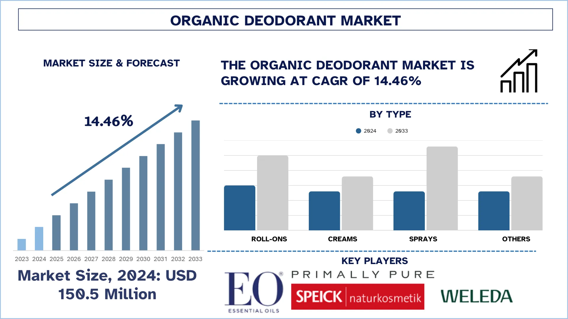The global Organic Deodorant Market was valued at USD 150.5 million in 2024 and is expected to grow to a strong CAGR of around 14.46% during the forecast period 2025- 2033