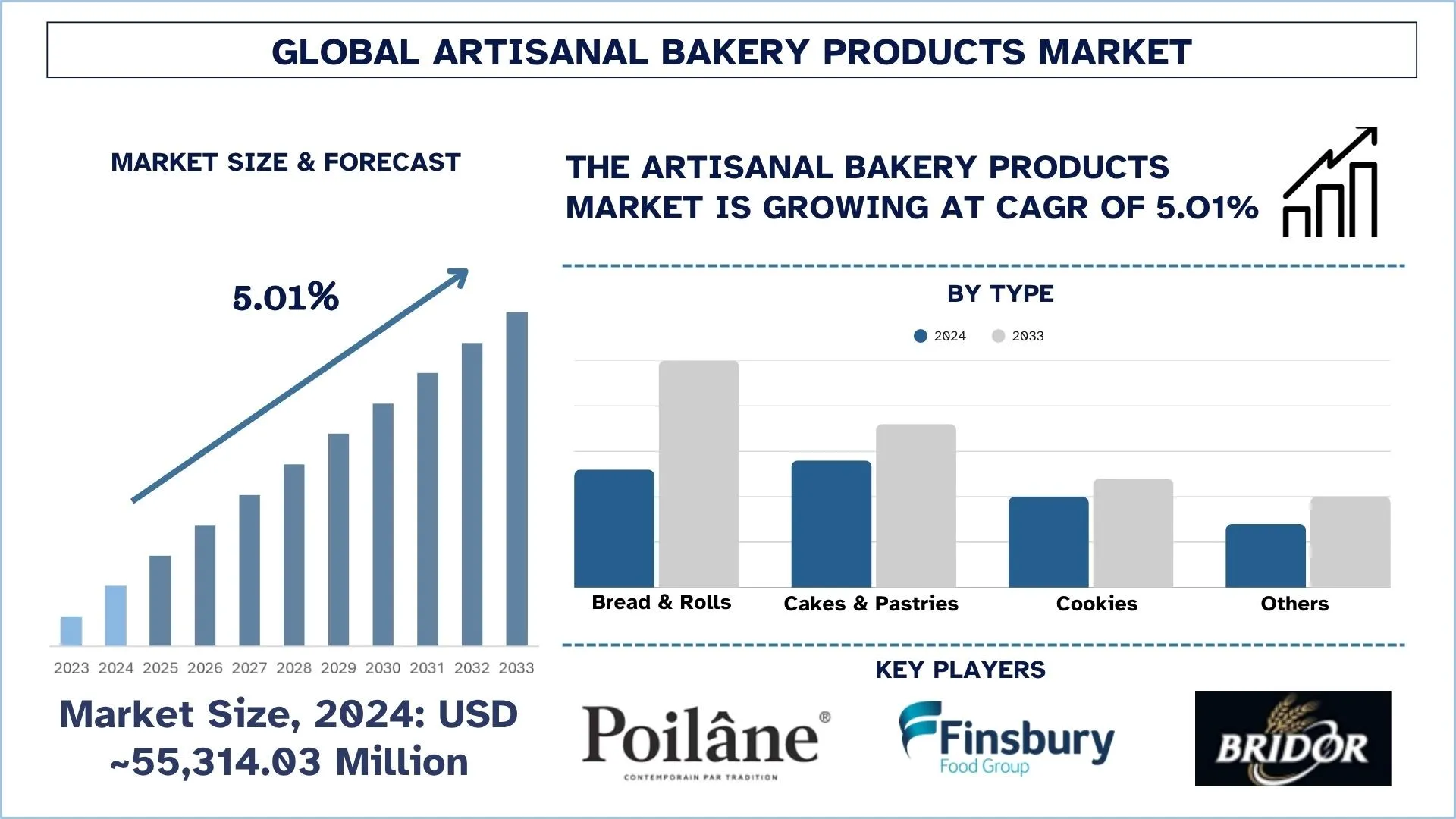 According to UnivDatos, the growing urbanization, a busy lifestyle, a craving for ready-to-eat snacks, and the rising demand for healthier food items drive the Artisanal Bakery Products market. According to their “Artisanal Bakery Products” report, the global Market was valued at USD 55,314.03 million in 2024, growing at a CAGR of approximately 5.01% during the forecast period from 2025 to 2033, to reach USD million by 2033.