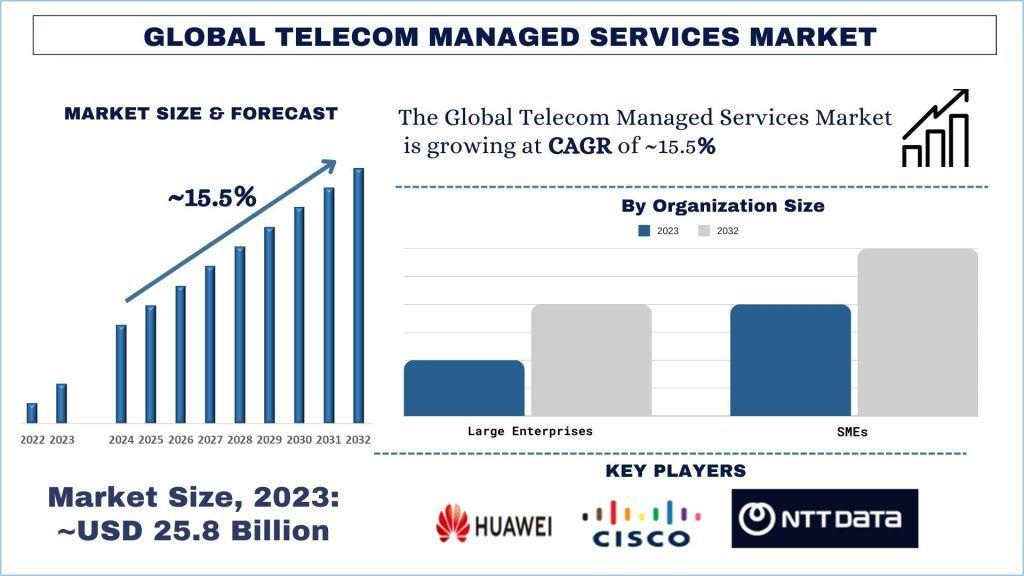 According to the UnivDatos, the rising demand for data services has been a primary driver of the Telecom Managed Services market. With the proliferation of smartphones, IoT devices, and digital services, telecom operators face unprecedented data traffic. This surge in data consumption is driving the need for advanced managed services to manage network congestion, optimize bandwidth allocation, and ensure quality of service. As per their “Telecom Managed Services Market” report, the global Market was valued at USD 25.8 Billion in 2023, growing at a CAGR of 15.5% during the forecast period from 2024 - 2032 to reach USD Billion by 2032.