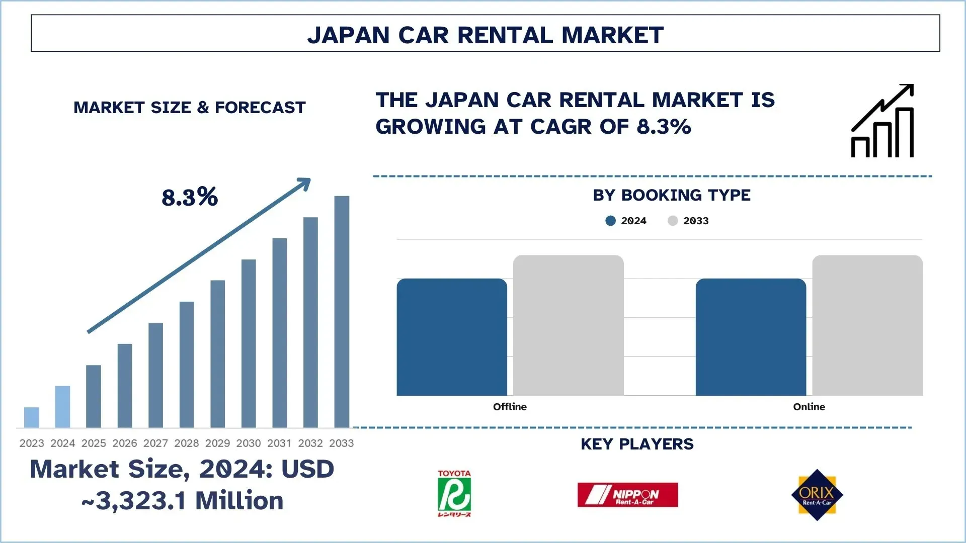 According to the UnivDatos, rising domestic and inbound tourism would drive the Japan Car Rental market. As per their “Japan Car Rental Market” report, the Market was valued at USD 3,323.1 Million in 2024, growing at a CAGR of about 8.3% during the forecast period from 2025 - 2033 to reach USD Million by 2033.
