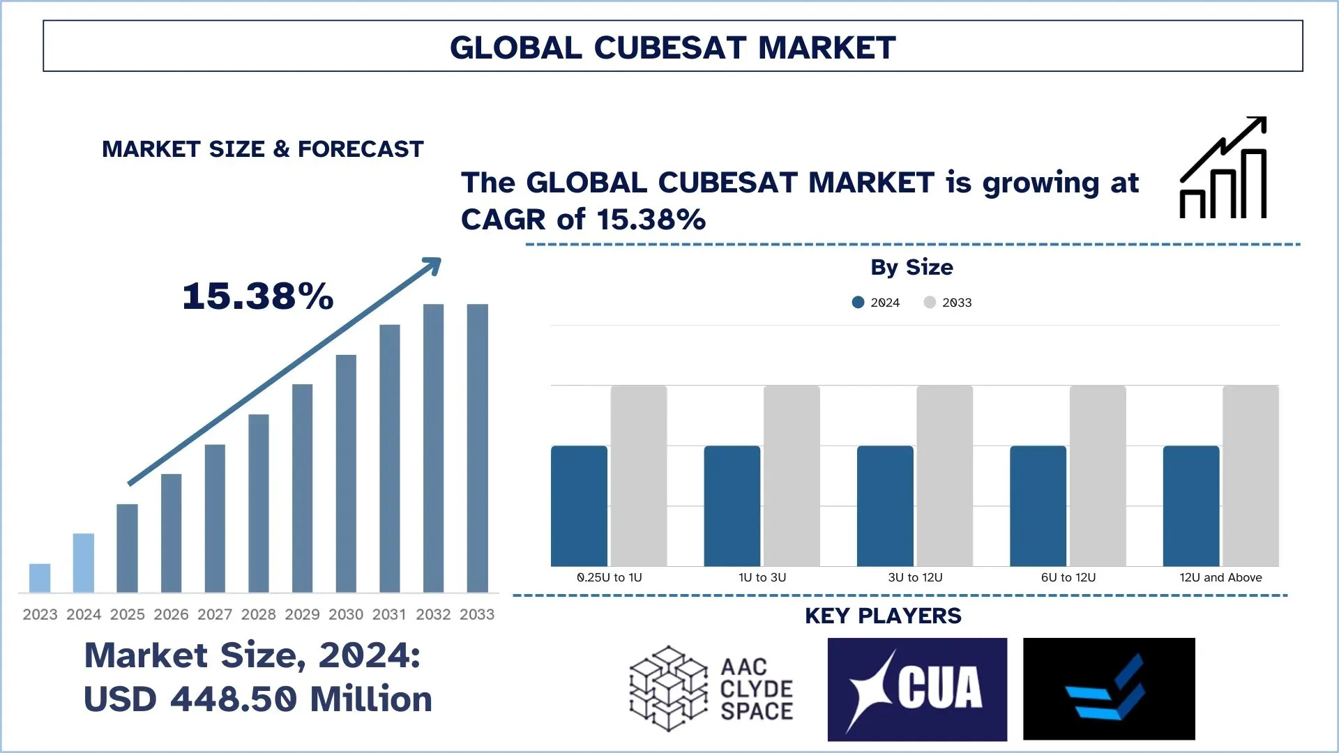 According to the UnivDatos, as per their “CubeSat Market” report, the global Market was valued at USD 448.50 million in 2024, growing at a CAGR of about 15.38% during the forecast period from 2025 - 2033 to reach USD million by 2033.